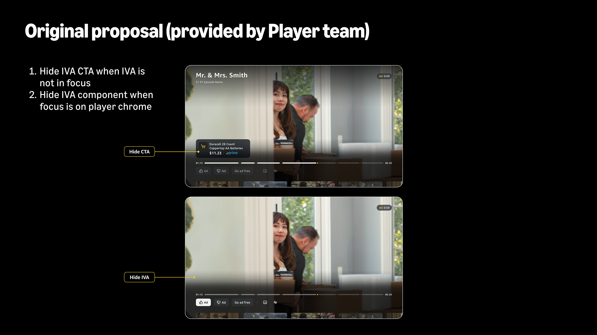 When we first started to explore how to integrate ads into the player chrome, the player team proposed we 1) Hide IVA CTA when IVA is not in focus and 2) Hide IVA component completely when focus is on player chrome. While these recommendations work well for player features like X-Ray, they did not work well for interactive ads especially since there is a limited time duration to interact with ads and ad interactivity on TV is still a relatively new concept.