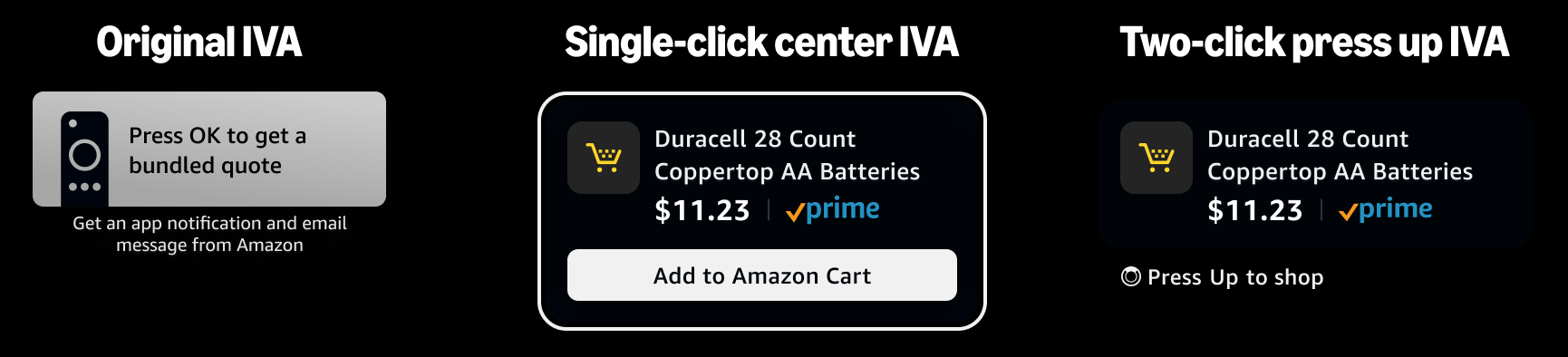 A clear call to action (CA) - intuitive and focusable CTAs for single-click actions to reduce cognitive load for viewer about how to interact. Viewers are familiar with this call to action from retail.