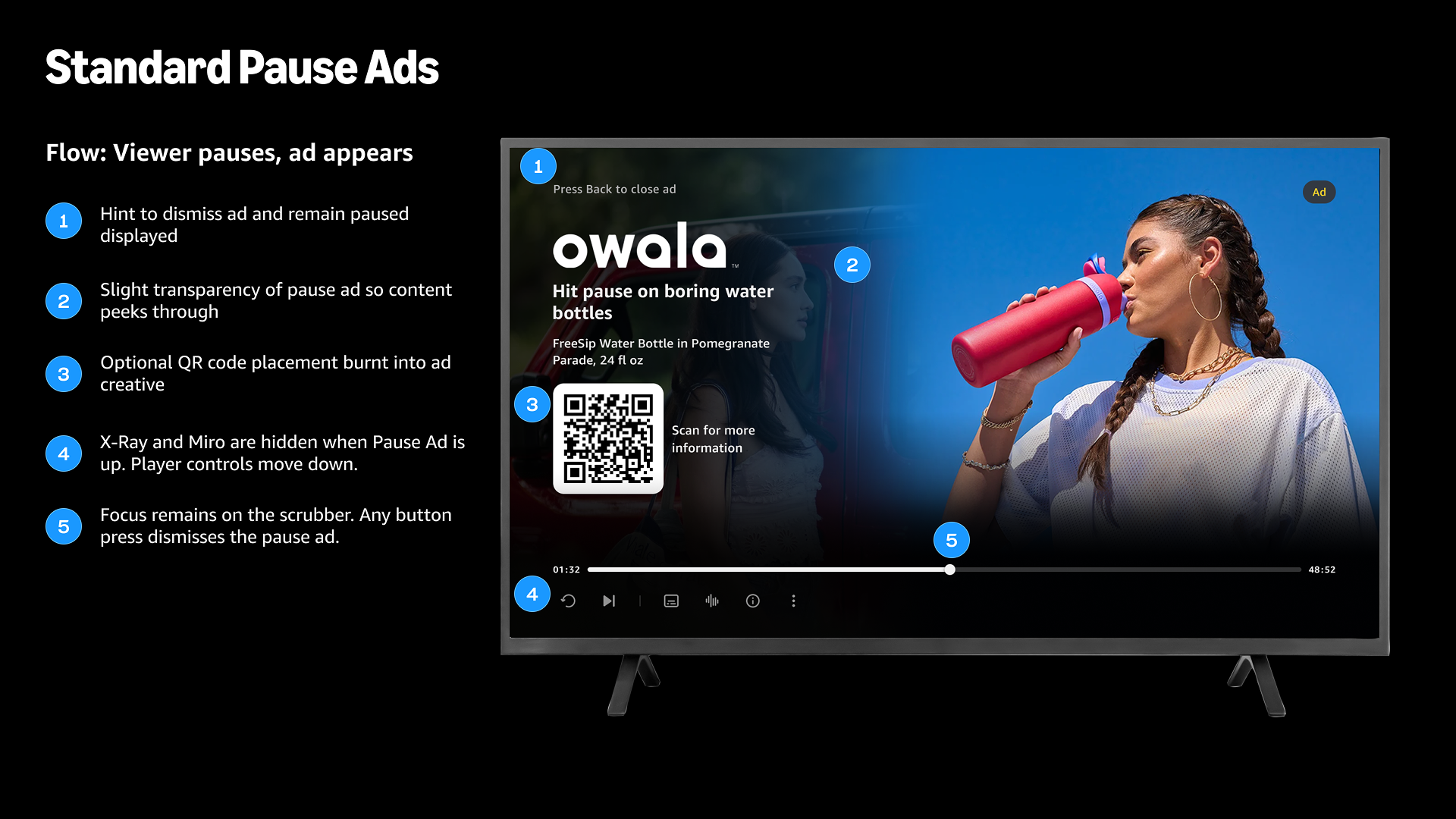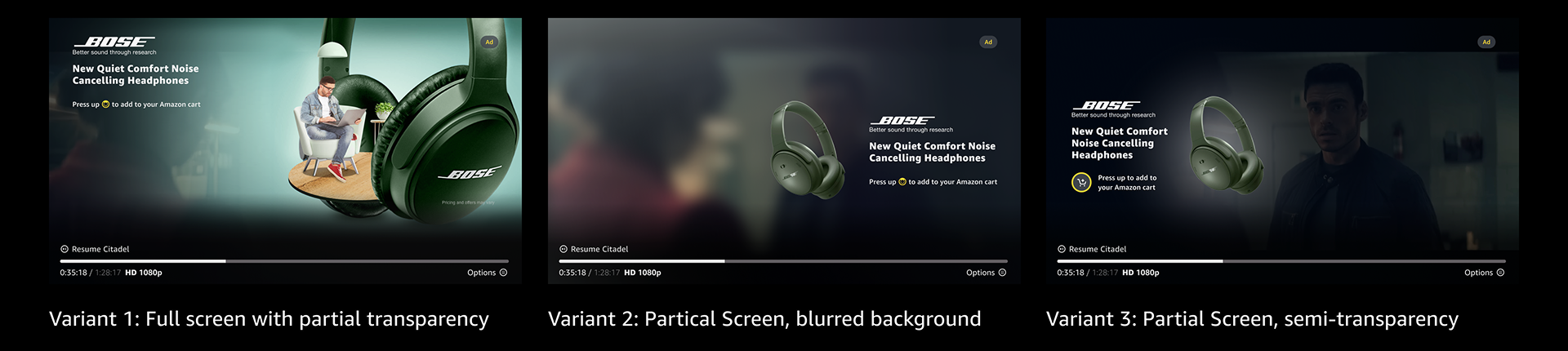 Standard pause ads are non-interactive meaning there is no remote interactivity available. Freevee, Amazon’s in-house FAST content, was an existing testing ground with standard pause ad infrastructure that would be a low- lift to reuse on FireTV (~20% of viewers). So while not our long term solution, we wanted to take the opportunity to get real data to help inform us quickly.